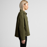 Construction: Three pocket, collared shirt jacket, unlined, gathered back at yoke, corozo buttons to close