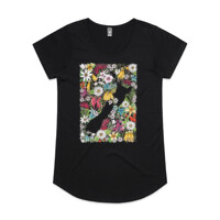 'Colourful Sea Of Flowers' art print New Zealand map t shirt by Pukekohe based Artist Kirsty McMahon. This quality feature a Kiwiana art print depicting a map of New Zealand adorned with a sea of native New Zealand flowers, including kowhai, pohutukawa, fuchsia, kaka beak, poro poro, and NZ bush clematis. This artwork was created using watercolour and ink pen